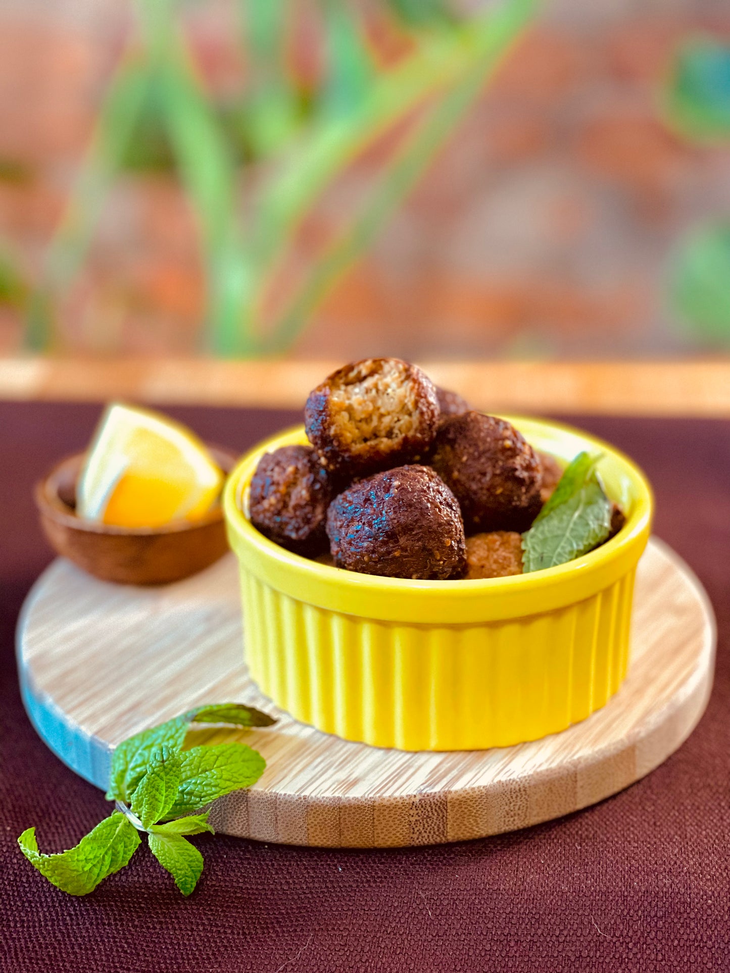 Savoury croquet made with star-fried TVP, blended with cooked quinoa, gluten-free bread and spices. It looks like some type of meatball deep-fried once is ready.