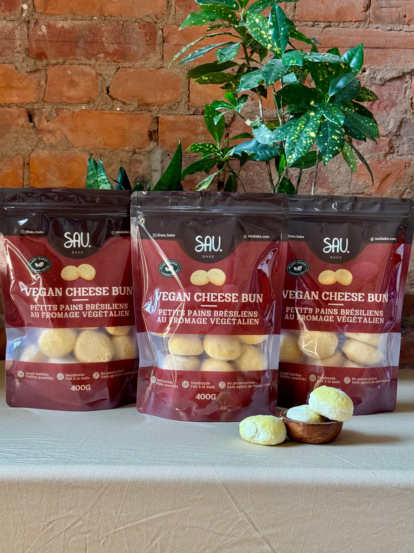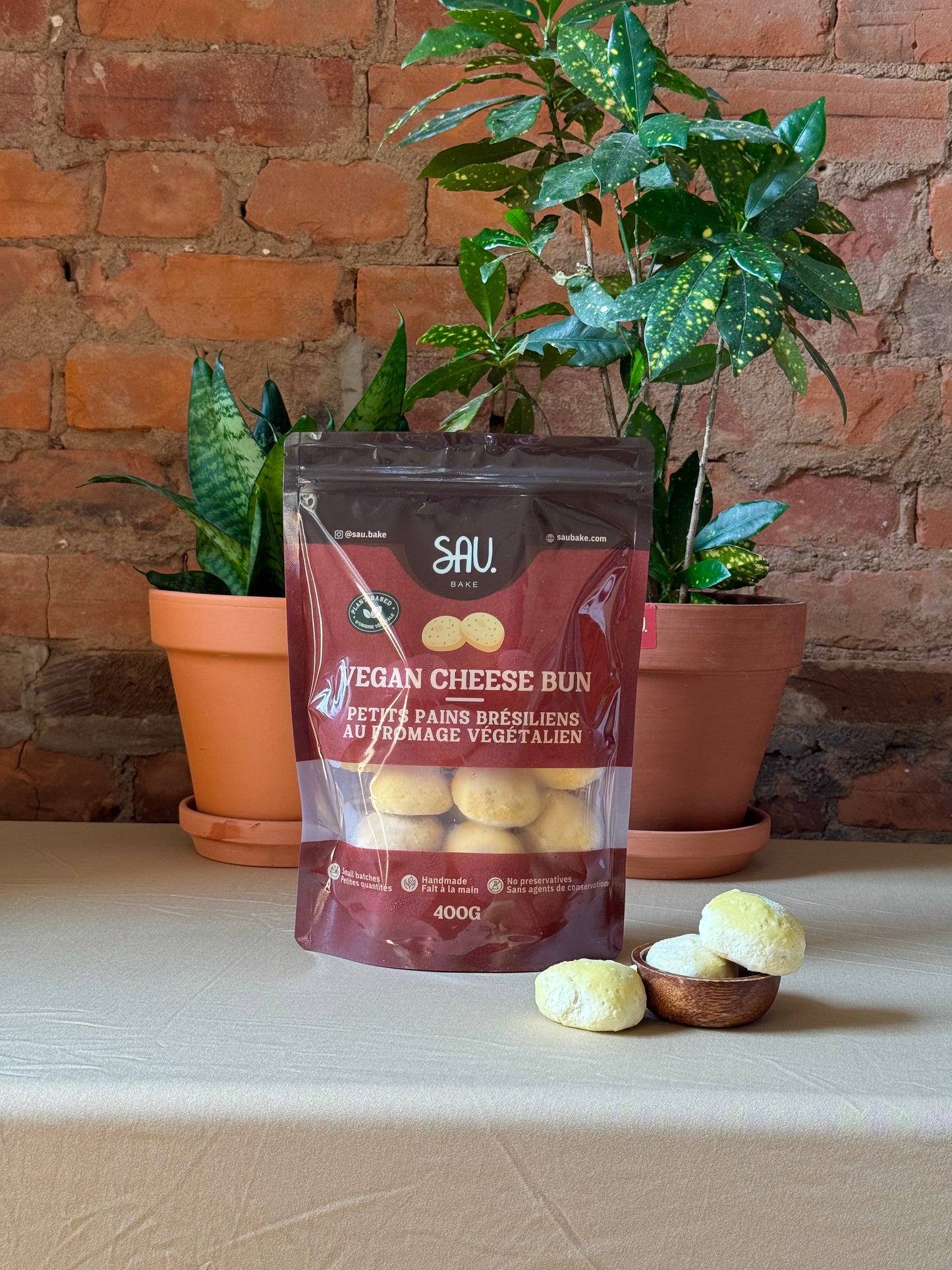 Famous Brazilian cheese bun, made with tapioca starch, vegan cheese, and potato flakes. Crunchy crust, fluffy centre slightly tart flavour.